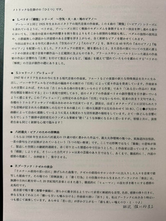 ベリオの「鍵盤シリーズ」は、本番で弾いてみたかった曲。「火のピアノ(1989)」、「空気のピアノ(1985)」は、「見つけられるべき曲線上の点(1974)」を少し彷彿とさせるものがあります。やはりベリオは収縮と拡張を繰り返しつつ耕した作曲家なのだなぁ。
